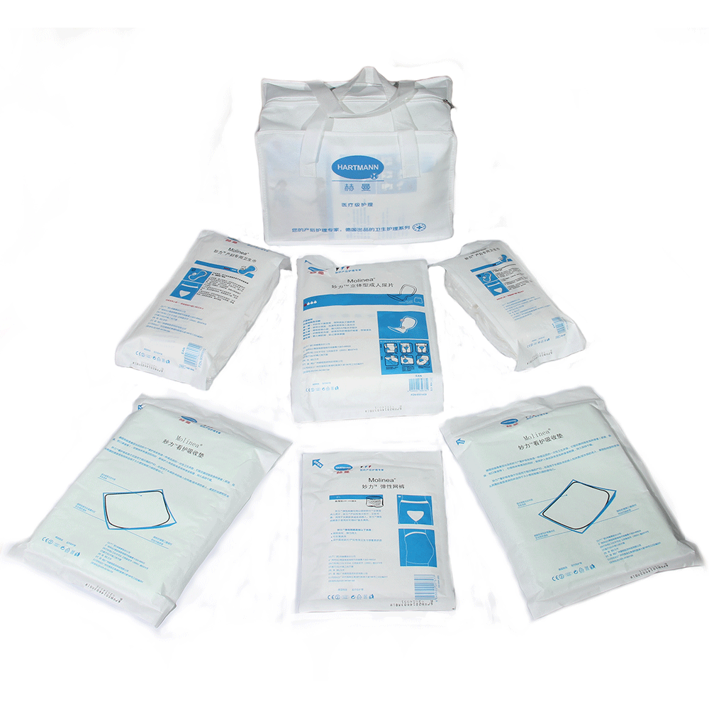 (一)"妙力"看护吸收垫 Molinea plus(进口)产品特点:三层结构及功能:表层:疏水无纺布层,迅速将液体导入并保持表面干燥,对皮肤无刺激优势:表层:加茸处理,使用柔软亲肤;波浪型压花,多触点缓冲皮肤压力预防压疮,并迅速均匀的分散液体