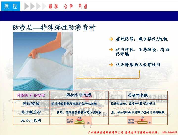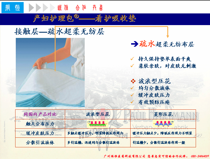 (一)"妙力"看护吸收垫 Molinea plus(进口)产品特点:三层结构及功能:表层:疏水无纺布层,迅速将液体导入并保持表面干燥,对皮肤无刺激优势:表层:加茸处理,使用柔软亲肤;波浪型压花,多触点缓冲皮肤压力预防压疮,并迅速均匀的分散液体