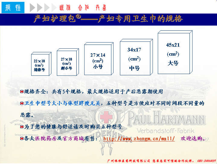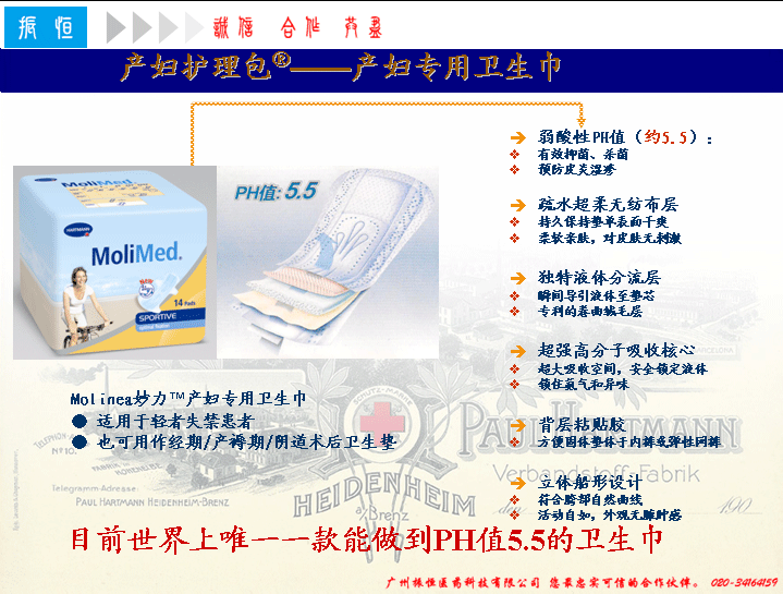 规格 货号 包装 MoliMed 大号 1686549 14片/包;12包/箱 MoliMed 中号 1686441 14片/包;12包/箱 MoliMed 小号 1686341 14片/包;18包/箱 MoliMed 超小号 1686249 14片/包;24包/箱 MoliMed 迷你号 1681329 14片/包;12包/箱卫生巾为什么非妙力™不可?独特的三步吸收核心层保障了最大限度的干燥!——稳定的纤维层——超吸收的核心层——卷曲的纤维分流层三层吸收核心-表层低致敏,减少损伤,防止产后感染低致敏,最上层是由一层经特别处理被称作卷曲纤维绒毛的特殊纤维素(专利技术)组成,无粘合剂、无荧光剂、无增白剂、减少过敏、减少损伤,防止产后感染三层吸收核心-中间层强锁水性——中间层是由纤维素加同质浓缩的超吸收材料(SAP)组成,水份可以全地锁定于此——1g纤维素具有吸收11g液体的能力——1gSAP在压力下能锁定52g液体而不流失,SAP也能安全地锁定任何气味三层吸收核心-基底层基底层全部由纤维素组成,储存液体优势:——稳定吸收垫——SAP不能通过聚乙烯薄膜为什么要选用产妇专用卫生巾:因为产妇产后的皮肤处于高度敏感时期,打开的子宫、侧切的伤口、大量的恶露都给细菌有机可趁,如果护理不当极易发生感染,留下各种妇科疾病,影响母亲一生的健康。而产妇专用卫生巾,是专为生产后妇女处于特殊时期而设计开发,减轻产妇的疼痛,安全而舒适。产品特性:本产品经德国各医疗机构推荐使用,德国原厂制造l 低致敏,最上层是由一层经特别处理被称作卷曲纤维绒毛的特殊纤维素(专利技术)组成,无粘合剂、无荧光剂、无增白剂、减少过敏、减少损伤,防止产后感染l PH值5.5弱酸性,抗菌性强,能最大限度减少产妇感染(目前世界上唯一一款能做到PH值5.5的卫生巾)l 内含超吸收材料SAP吸水速度超快,锁水性极好,真正的瞬间吸收,表面瞬间干爽,无异味l 透气性极佳,采用可呼吸无纺布(背衬),可令产妇肌肤保持清新呼吸,利于产后恢复l 穿着舒适,皮肤亲和度高,操作简便分5个型号大小,轻松应对产妇产褥期不同恶露量。规格齐全共有5个规格,最大规格适用于产后恶露期使用卫生巾型号大小与体型胖瘦无关,五种型号是方便应对不同时间段不同量的恶露。为了您的健康与舒适请及时购买五种型号
