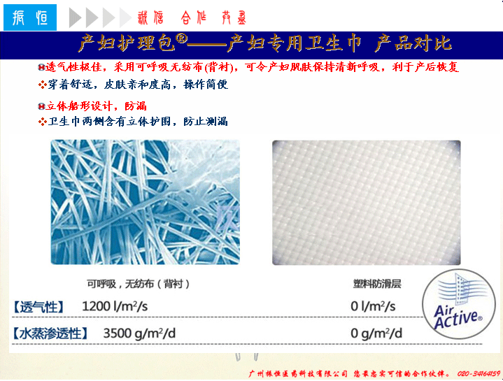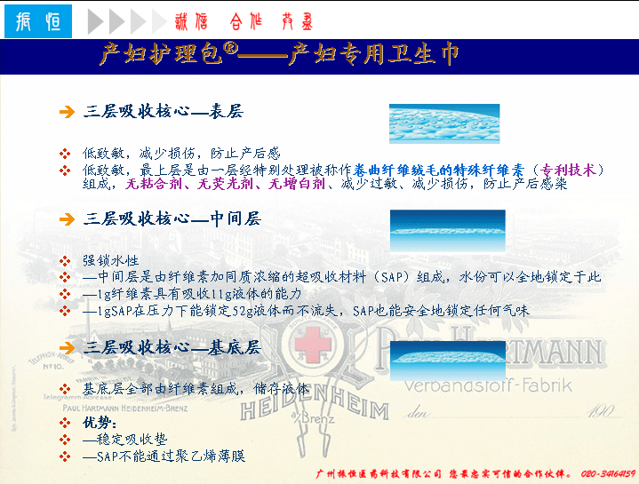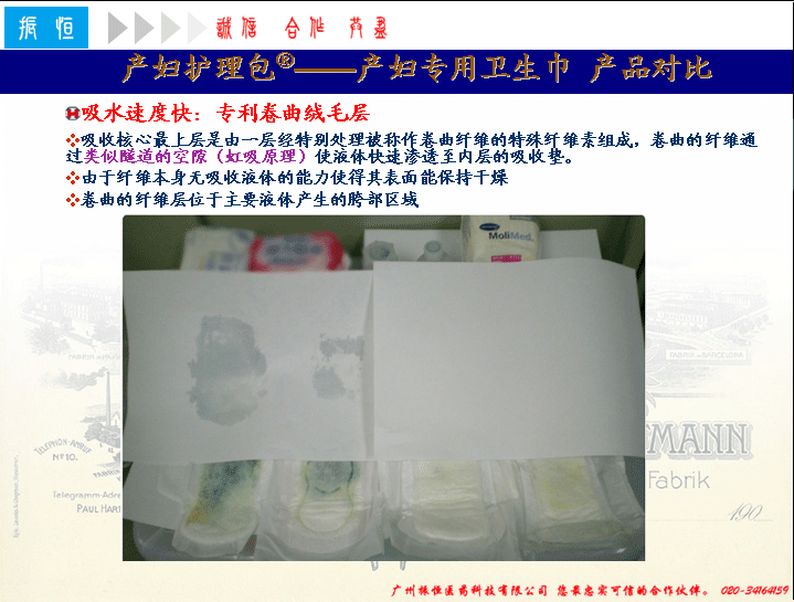 疏水超柔无纺布层l 持久保持垫单表面干爽l 柔软亲肤,对皮肤无刺激独特液体分流层l 瞬间导引液体至垫芯l 专利的卷曲绒毛层超强高分子吸收核心l 超大吸收空间,安全锁定液体l 锁住氨气和异味背层粘贴胶l 方便固体垫体于内裤或弹性网裤立体船形设计l 符合胯部自然曲线l 活动自如,外观无臃肿感(三)