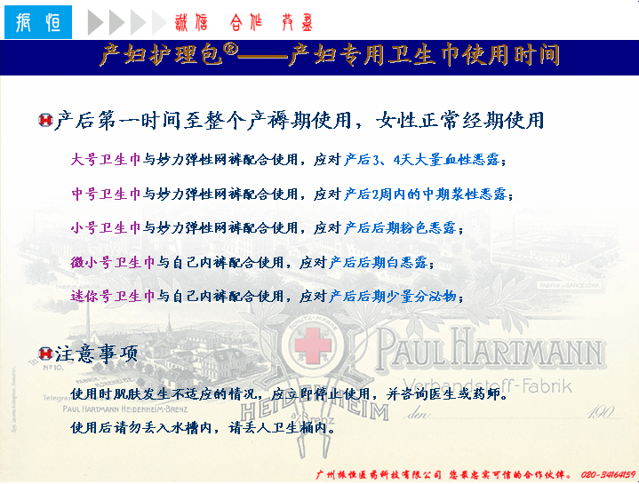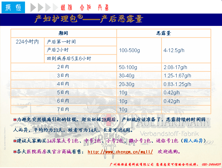 期间 恶露量 224小时内 产后第一时间 100~500g 4~12.5g/h 产后2小时 回到病房后5至6小时 2日内 50~100g 2.08~17g/h 3日内 30~40g 1.25~1.67g/h 4日内 20~30g 0.83~1.25g/h 5日内 10g 0.42g/h 6日内 10g 0.42g/h 7日内 10g 为避免突然镇痛引起的惊慌,超出妊娠28周后,产妇就应该准备了,恶露持续的时间因人而异,平均约为21天,短者可为14天,长者可达6周。建议大家购买14片装大号1包、中号2包、小号2包、微小号1包、超小号1包(因人而异)使用时间产后第一时间至整个产褥期使用,女性正常经期使用l 大号卫生巾与妙力弹性网裤配合使用,应对产后3、4天大量血性恶露;l 中号卫生巾与妙力弹性网裤配合使用,应对产后2周内的中期浆性恶露;l 小号卫生巾与妙力弹性网裤配合使用,应对产后后期粉色恶露;l 微小号卫生巾与自己内裤配合使用,应对产后后期白恶露;l 超小号卫生巾与自己内裤配合使用,应对产后后期少量分泌物;注意事项l 使用时肌肤发生不适应的情况,应立即停止使用,并咨询医生或药师。l 使用后请勿丢入水槽内,请丢人卫生桶内。卫生巾需要多久更换一次?细菌滋生的四个条件是:温度、温度、时间和营养卫生巾上的恶露易成为细菌大肆滋生的“培养基地”,在潮湿闷热的环境中细菌又会大量繁殖。所以妇产科医生建议每2小时更换一次。温馨提醒:产后恶露排出期间要特别注意清洁卫生,勤换卫生巾避免湿透滋生细菌,一般每2小时更换一次为最佳生产患处及日常护理建议使用清洁棉为什么必须使用Molinea 妙力™高级产妇专用卫生巾?1.安全需要严格的质量检测,达到PH值5.5弱酸性.抗菌性强,每片卫生巾重量统一,科学检测出血量,恶露量,确保产妇生命安全!温馨提示:产前,为了对恶露进行观察,必须使用产妇专用卫生巾,普通的生理卫生巾是无法测试的2.健康需要内含超吸收材料SAP吸水速度超快,锁水性极好,真正的瞬间吸收,表面瞬间干爽,无异味温馨提示:产后阴部皮肤高度敏感,护理不当极易感染3.舒适需要穿着舒适,皮肤亲个度高,操作简便,柔软舒适滑爽,最大限度减轻产后疼痛!温馨提示:产后产妇伤口疼痛,普通护理用品极易加重疼痛!4.透气需要透气性极佳,采取可呼吸无纺布(背衬),可令产妇肌肤保持清新呼吸,利于产后恢复温馨提示:产后产妇伤口疼痛,普通护理用品极易加重疼痛!