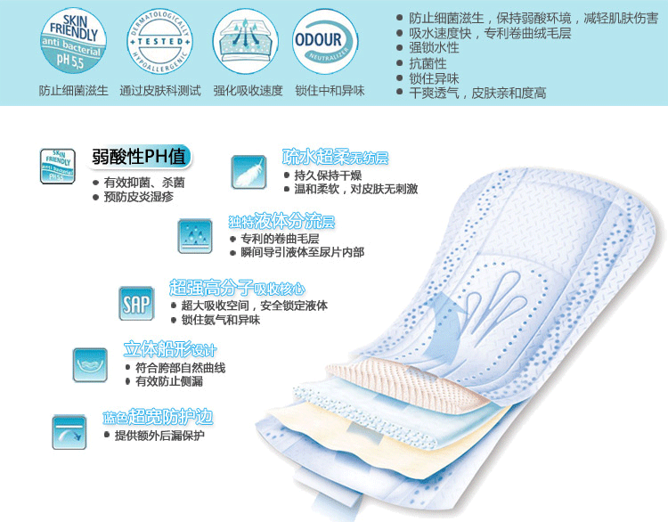 疏水超柔无纺布层l 持久保持垫单表面干爽l 柔软亲肤,对皮肤无刺激独特液体分流层l 瞬间导引液体至垫芯l 专利的卷曲绒毛层超强高分子吸收核心l 超大吸收空间,安全锁定液体l 锁住氨气和异味背层粘贴胶l 方便固体垫体于内裤或弹性网裤立体船形设计l 符合胯部自然曲线l 活动自如,外观无臃肿感